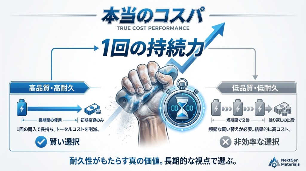 チョークの費用対効果は、単純なグラム単価ではなく「一度の塗布でどれだけ登り続けられるか」という持続力で判断すべきです。一見すると安価な大容量パックはお得に感じられますが、グリップ力が弱く数手で落ちてしまうようでは、頻繁な付け直しが必要となり消費スピードが早まります。