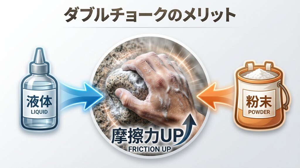 ここぞという本気トライやコンペティションの場面では、液体タイプを下地に塗り、その上から粉末タイプを叩く「ダブルチョーク(重ね塗り)」が最も強力なグリップ力を生み出します。