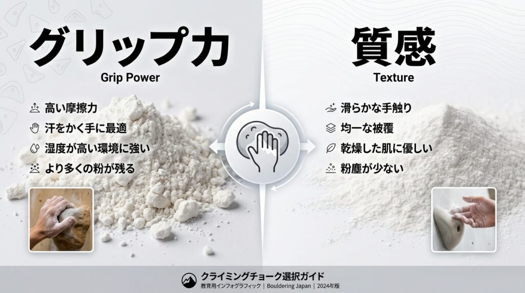自分に合うチョークを見つけるには、単に「滑らない」だけでなく、グリップの「質」そのものを見極める視点が必要です。大きく分けて、乾燥させて物理的な摩擦を生む「サラサラ・キシキシ系」と、適度な湿度を持たせて張り付く「しっとり・ペタペタ系」の2パターンが存在するからです。