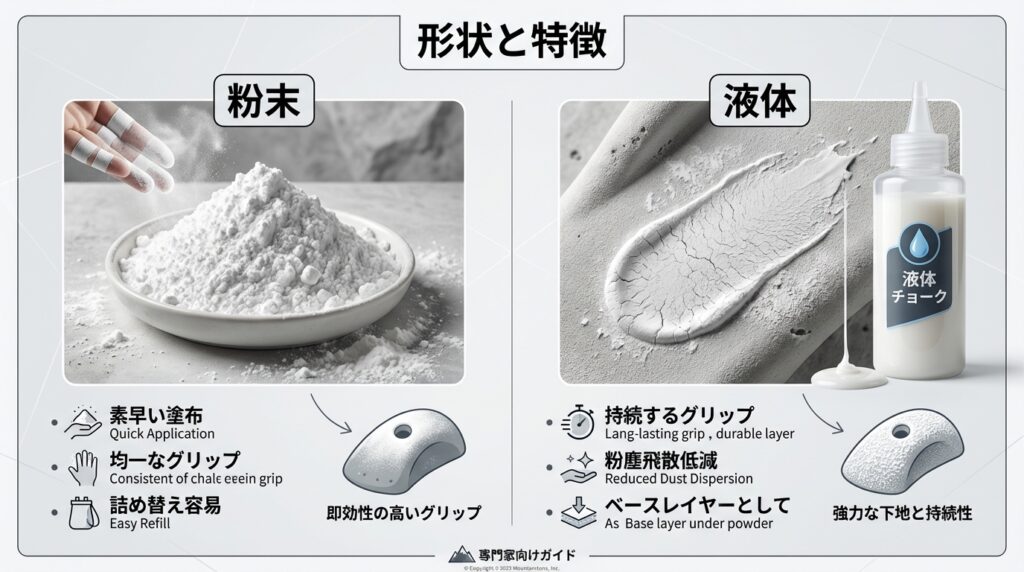 チョークの形状は大きく分けて「液体(リキッド)」「粉末(パウダー)」「固形(ブロック)」の3種類が存在し、それぞれ得意とする役割が異なります。