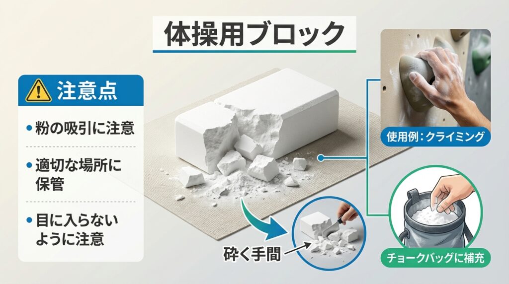 体操用ブロックチョークを代用品として検討する際は、圧倒的なコストパフォーマンスと引き換えに、使用感や手間に明確な違いがある点を理解しておきましょう。
