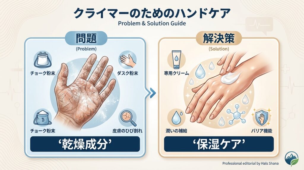 手荒れを防ぐための基本ケアとして、登り終わった直後に必ず石鹸で手を洗い、指紋に入り込んだチョーク成分を完全に落とす習慣をつけてください。