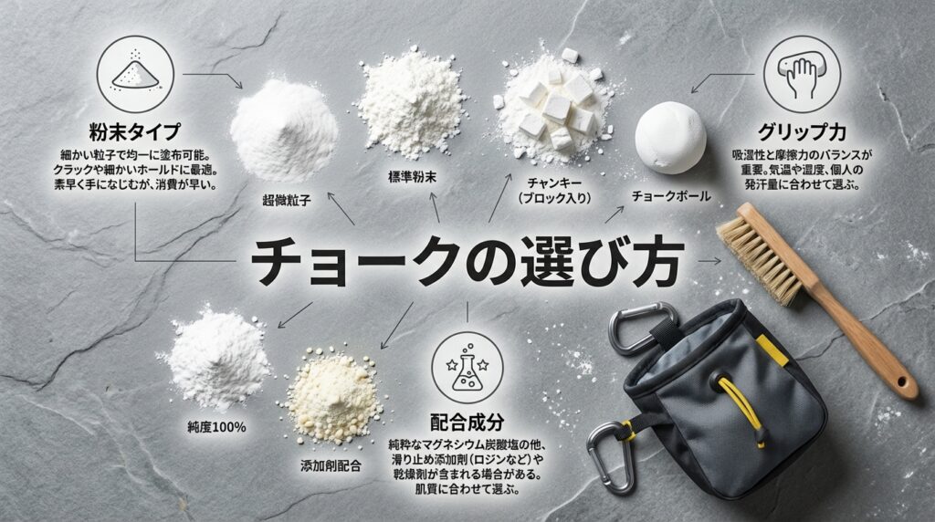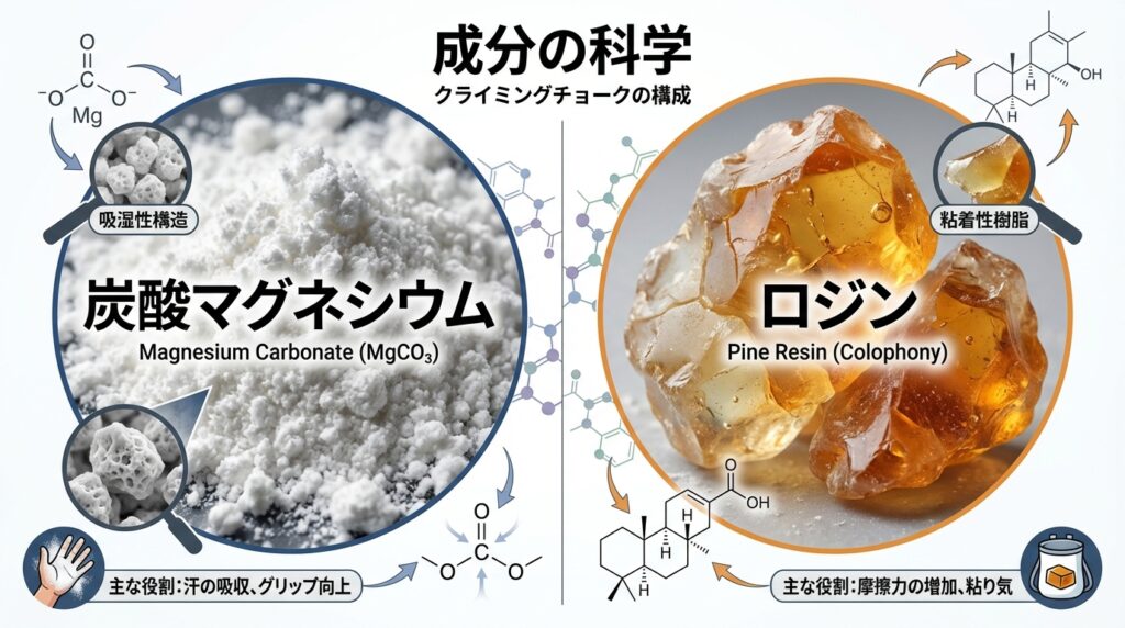 チョークの性能差を生み出す決定的な要素は、主成分である「炭酸マグネシウム」の品質と、摩擦を補助する「添加物」の配合バランスにあります。白い粉の正体を知ることで、感覚だけでなく論理的に自分に合う製品を選び抜くことが可能です。