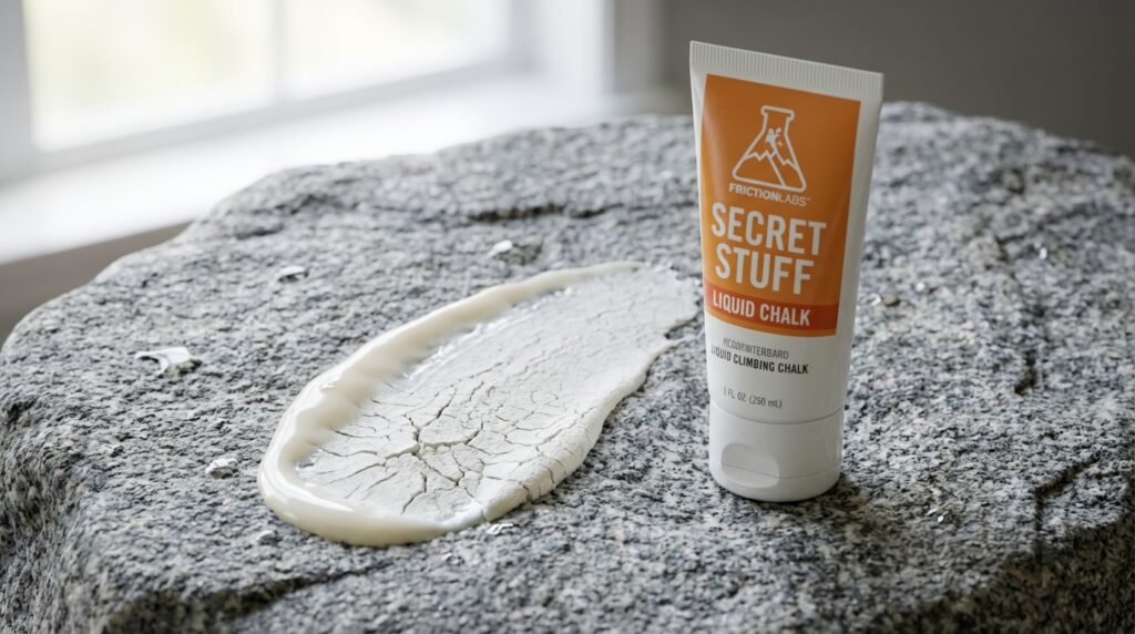 FrictionLabsのGorilla Gripのように塊(チャンク)が混ざったタイプなら、登る直前に指で潰すことで、常に新鮮な粉を指先に定着させると良いでしょう。