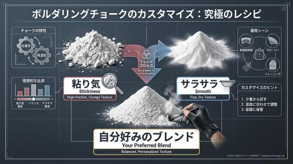 また、粉末の中にゴロゴロとした塊(チャンク)をあえて混ぜ込み、登る直前に指で押し潰して定着力を高めるのも効果的でしょう。まるで科学実験のように試行錯誤を繰り返し、自分にとっての「最高に止まる配合」を探求することも、道具への愛着を深める楽しみ方ではないでしょうか。
