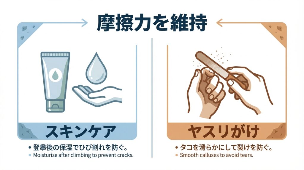 登り終えた後の保湿クリームは必須ですが、それ以上に重要なのが「紙やすり(サンドペーパー)」による角質ケアかもしれません。