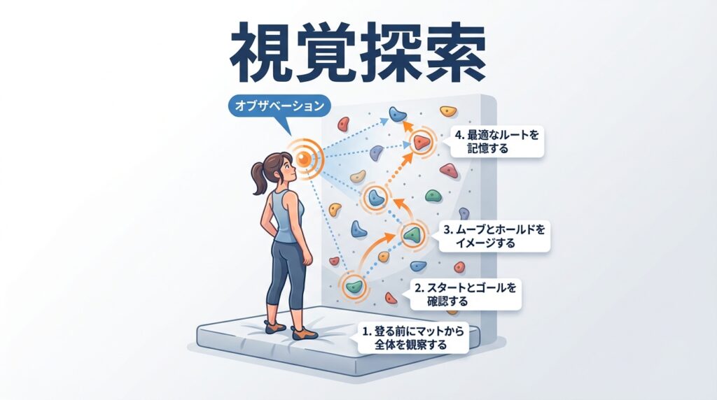 多くの初心者は、足を運ぶ動作の途中で視線を次のハンドホールド(手で掴む突起物)に移してしまい、感覚だけで足場を探る傾向にあります。