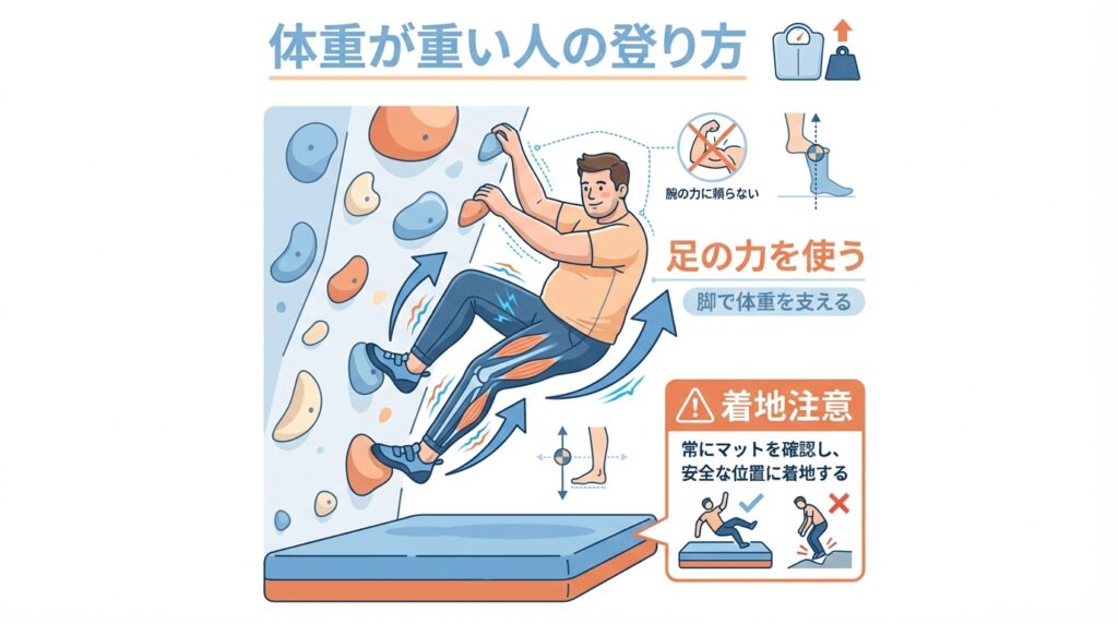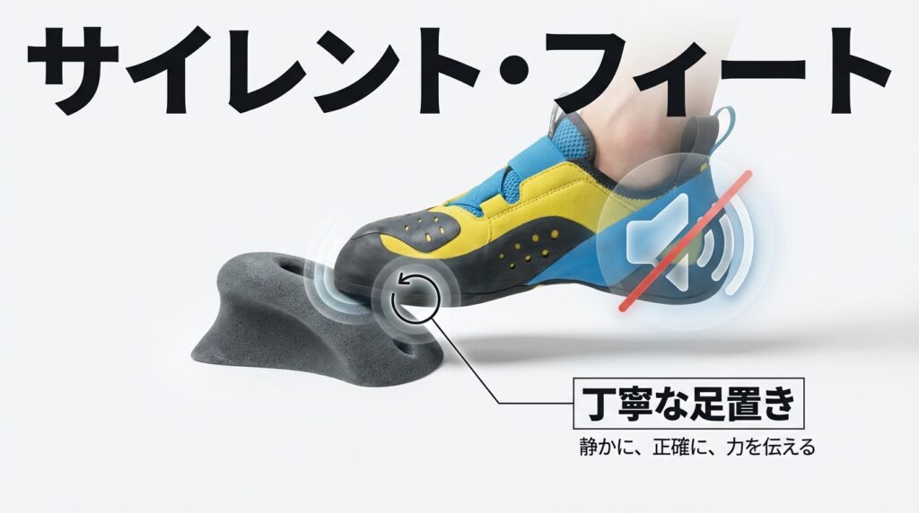 足音が鳴るような雑な置き方をすると、その衝撃で指が外れそうになり無駄な力が入ってしまうため、「コツ7|サイレント・フィート」で静かに正確に足を置く技術を磨くことが、体重のある人ほど効果的と言えます。