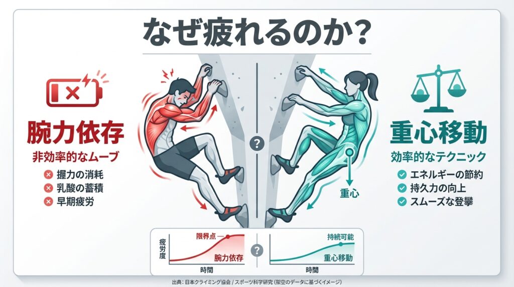 人間の身体構造上、どれほど鍛え抜かれた筋肉であっても、全体重を腕だけで支え続ければわずか数分で限界を迎えます。初心者が登り始めてすぐに腕が動かなくなってしまうのは、決して筋力不足が原因ではありません。重力に逆らって無駄な力を使いすぎている、つまり「燃費の悪い登り方」をしていることが最大の要因です。
