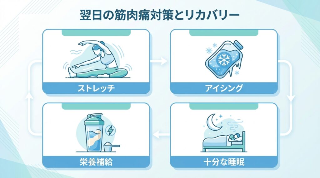 翌日に筋肉痛が残っている場合は、完全に身体を動かさないよりも「アクティブレスト(積極的休養)」を取り入れるのがおすすめです。
