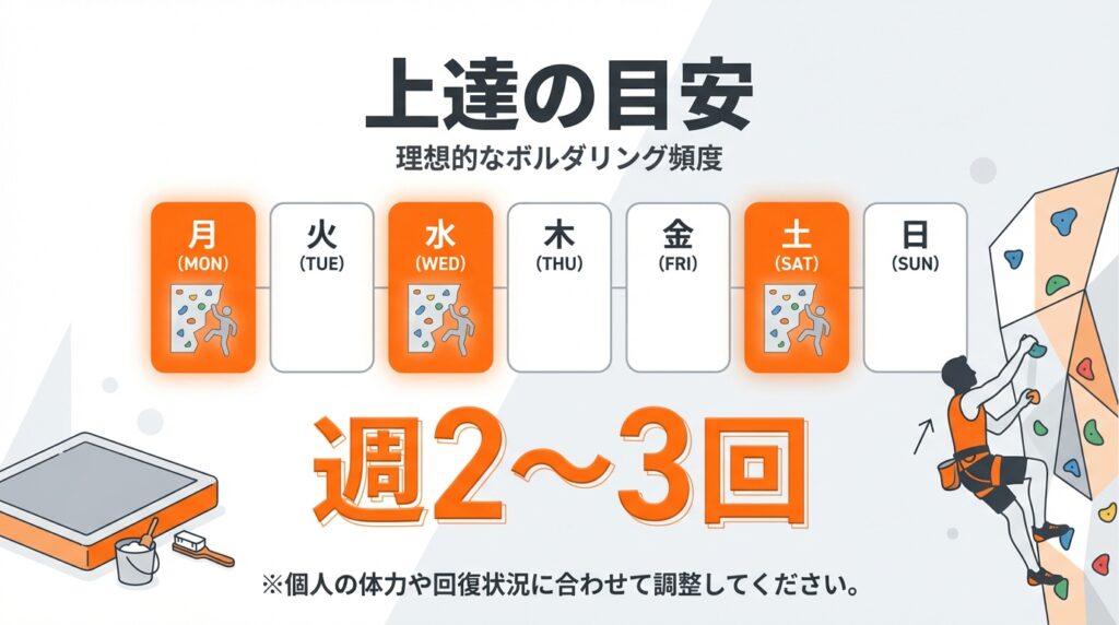 たとえば、火曜日の仕事帰りと土曜日の休日に登るようなサイクルを作ると、疲労回復と技術習得のバランスが最も良く取れるでしょう。