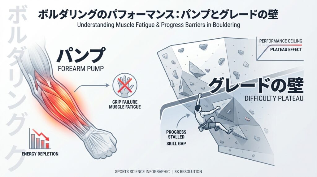 初心者が5級や6級といった特定のグレードで壁にぶつかる主な原因は、筋力不足よりもこのパンプへの対応力不足にあります。ホールドを必要以上の力で握り続けたり、呼吸を止めたりすることで、自らパンプを加速させてしまっているケースが非常に多いです。