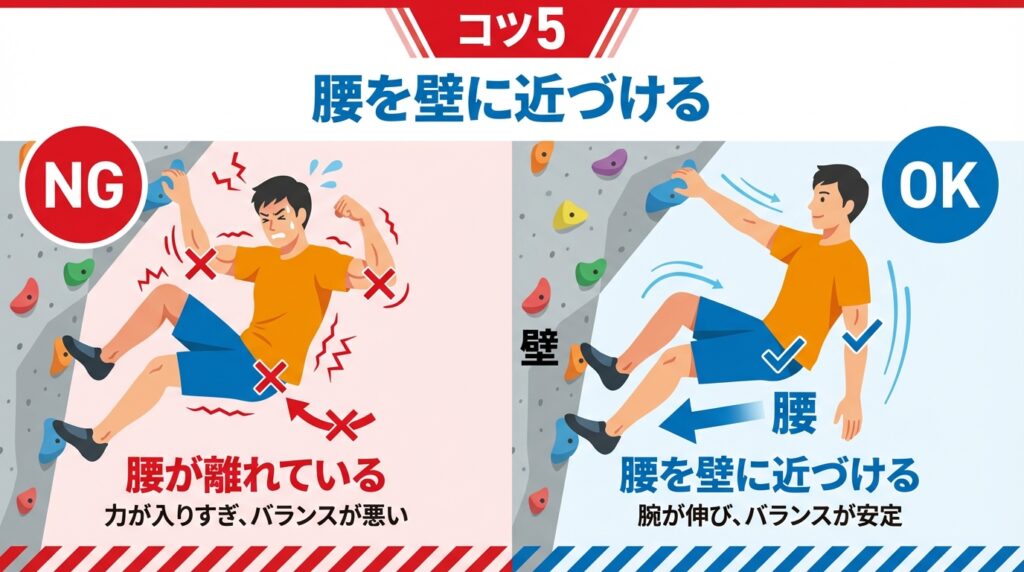 腕力を温存して登り続けるための核心は、腰を壁の限界まで近づける重心移動にあります。