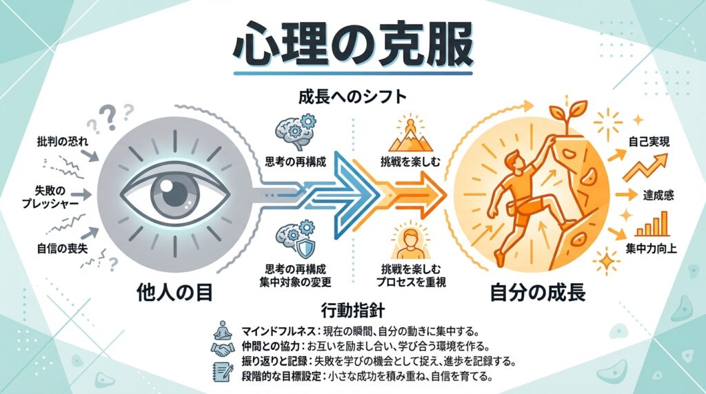 周囲の視線が気になってトライ回数が減ってしまうことこそが、最も避けるべき事態と言えます。