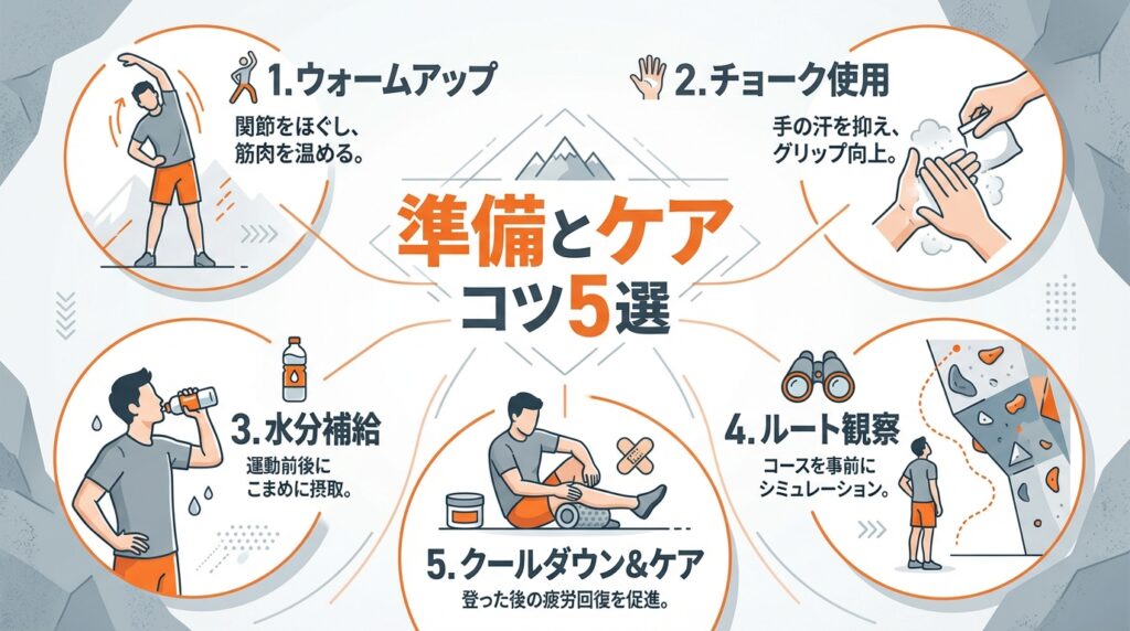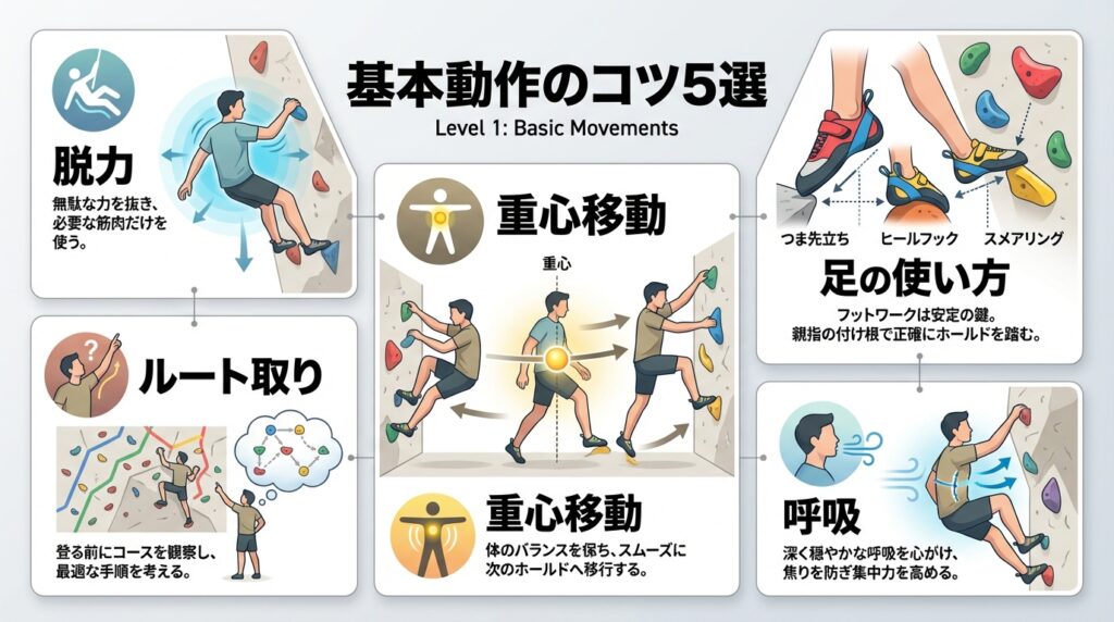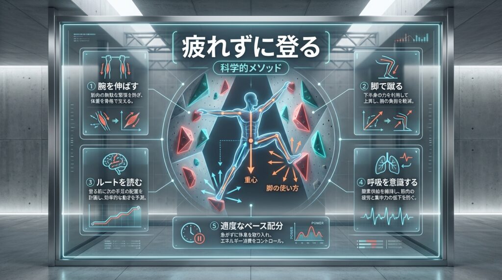 多くの初心者が壁にぶつかる原因は、筋力不足ではなく、身体の使い方の非効率さにあります。まずは以下の5つのポイントを意識し、無駄なエネルギー消費を抑えることから始めましょう。