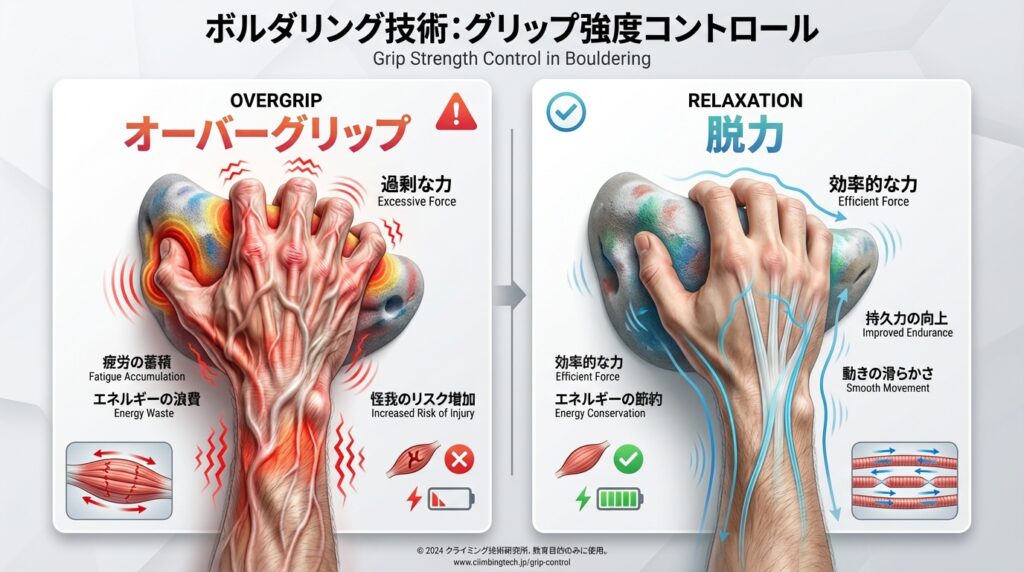 初心者がすぐにパンプしてしまう最大の理由は、恐怖心から来る「オーバーグリップ(過剰な握り込み)」にあります。