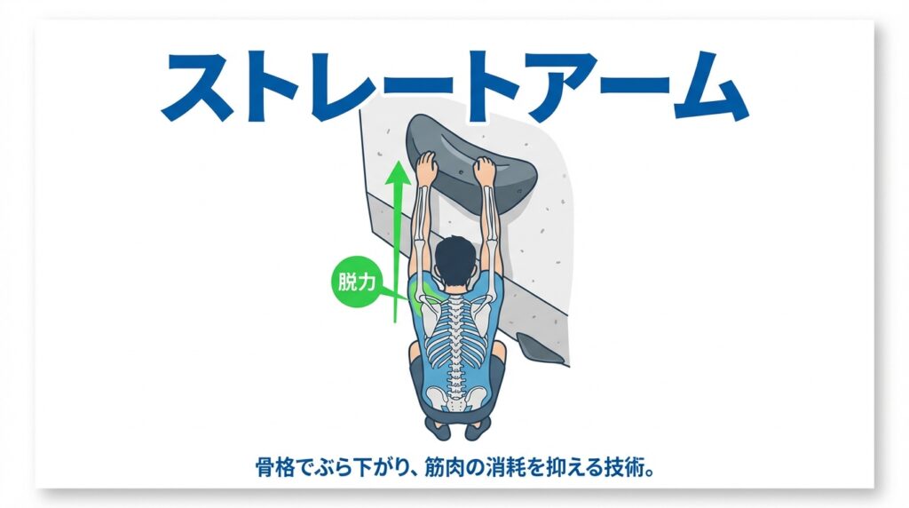 ボルダリングにおいて最も重要かつ基本となる姿勢は、常に肘を伸ばしきった「ストレートアーム」の状態を保つことです。壁に張り付いている間、恐怖心から身体を壁に引き寄せようとして、無意識に腕を曲げたままにしている初心者が後を絶ちません。しかし、これでは常に懸垂をしているのと同じ負荷がかかり続け、ものの数分で前腕がパンプして動かなくなってしまうでしょう。