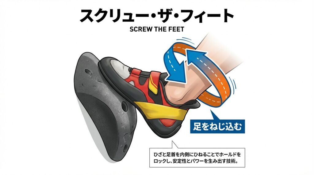 かかとが下がって固定されると、次のホールドへ身体を捻る動作や、遠くへ足を伸ばす動きがスムーズに行えません。