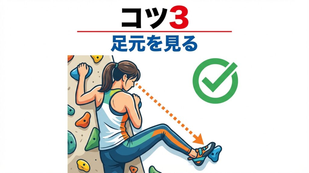 具体的には、つま先がホールドに触れただけで安心せず、体重がしっかりと乗り切るまで凝視し続けてください。