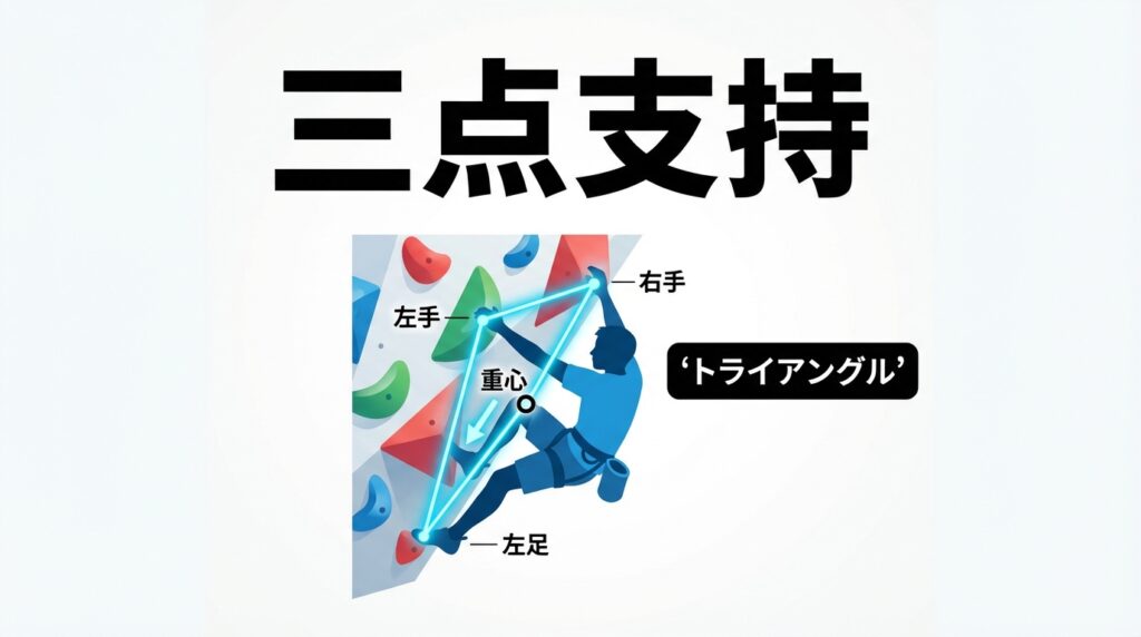 多くの初心者がバランスを崩して落下するのは、焦って手足をバタバタと動かし、この三角形を崩してしまうことが主な原因です。