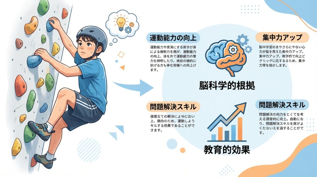 ボルダリングは、単に壁を登るだけの運動ではありません。近年の研究では、脳の働きを活性化させ、子供の心身の発達に多大な影響を与えることがわかっています。