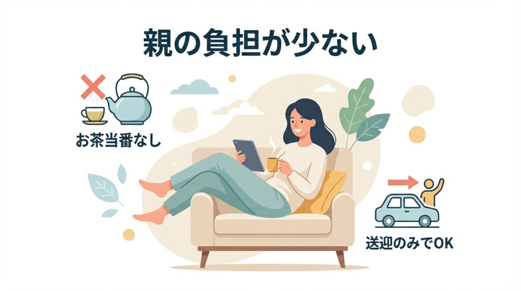 貴重な休日を丸一日潰すことなく、親自身のライフスタイルも大切にしながら続けられる点は、多忙な共働き家庭にとって非常に合理的な選択肢でしょう。