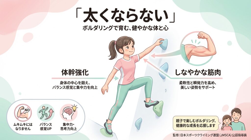 ボルダリングは自分の体重を支える「自重運動」であり、筋肉を肥大させるような高重量のトレーニングとは性質が異なるためです。