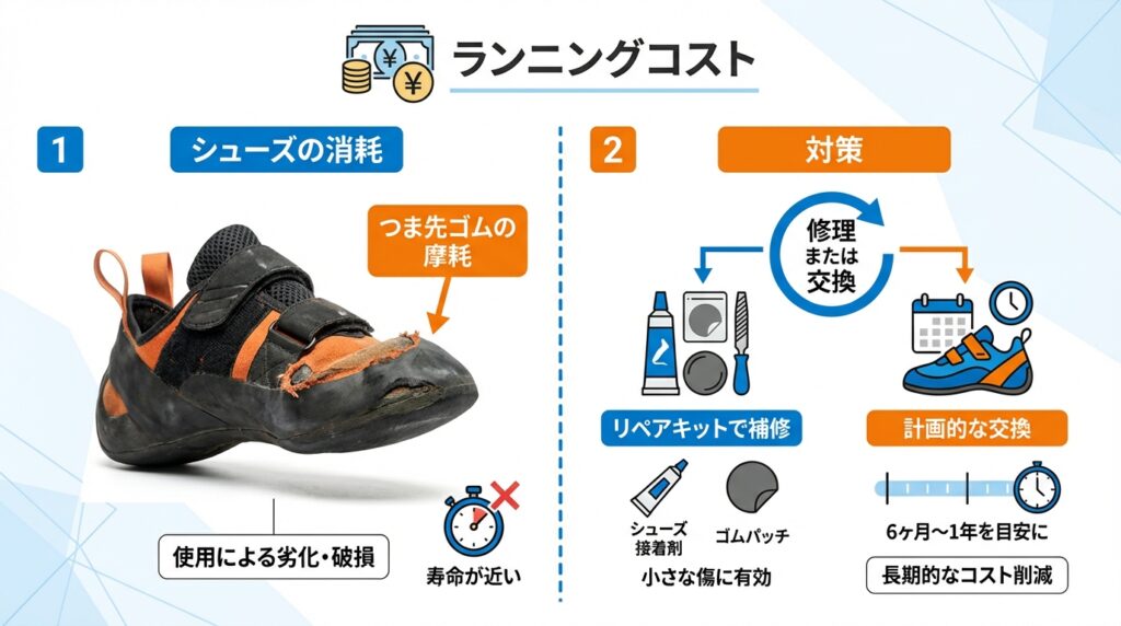 サッカーのスパイクや運動靴がサイズアウトまで持つのに対し、ボルダリングシューズは技術が未熟なうちは物理的な摩耗によって短命に終わる傾向が顕著です。