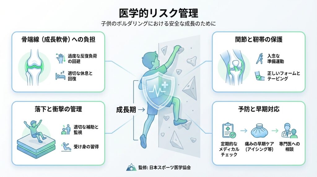 成長期の子供が本格的にボルダリングに取り組む際、最も警戒すべき医学的リスクが「骨端線損傷」です。