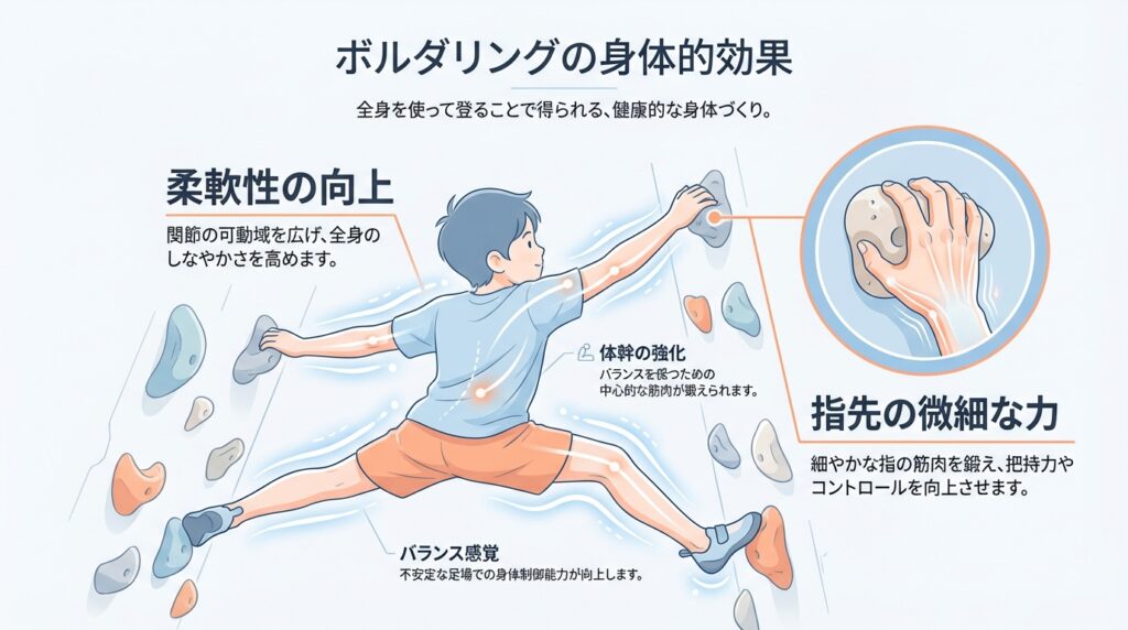 ボルダリングの壁を登る一連の動作は、股関節や肩甲骨周りの柔軟性を飛躍的に高めます。