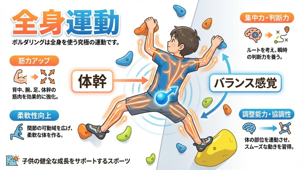 ボルダリングは、運動神経が著しく発達する「ゴールデンエイジ」の子供たちにとって、理想的な全身運動といえます。