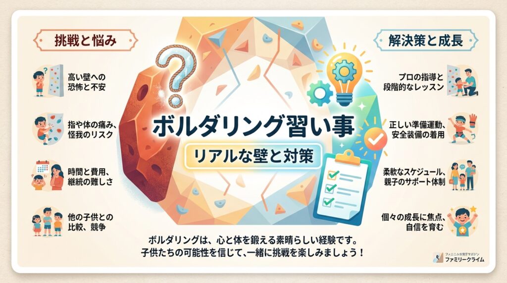 スクールを選ぶ際は、子供の年齢に応じた負荷制限を設け、「キャンパシングはまだ禁止」と明確に指導できる知識を持ったコーチの元に通わせることが、親ができる最大のリスク管理と言えるでしょう。
