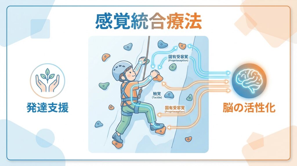 欧米の教育先進国や療育の現場において、ボルダリングは単なるスポーツの枠を超え、「感覚統合療法」の有効なツールとして認知されています。壁を登るという行為そのものが、脳の発達に不可欠な刺激を効率よく与えるからです。