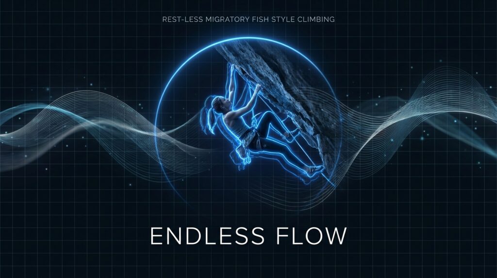 彼女は、ホールドを保持している時間(Time Under Tension)が他選手より圧倒的に長いにもかかわらず、レストを挟まずに次のムーブへと移行し続けます。これは、爆発的な出力で一気に高度を稼ぐヤンヤ・ガンブレット(Janja Garnbret)のような欧米のパワー型スタイルとは対極に位置するものです。止まることなく動き続けることで、筋肉の硬直を防ぎ、有酸素系のエネルギー回路を回し続けるその様は、さながら「レストなき回遊魚」です。